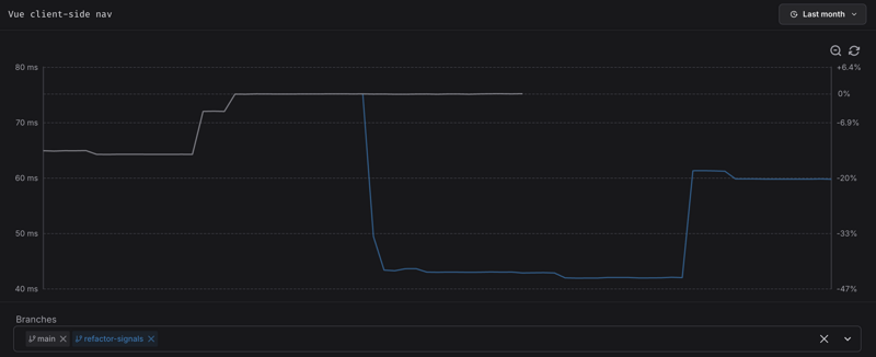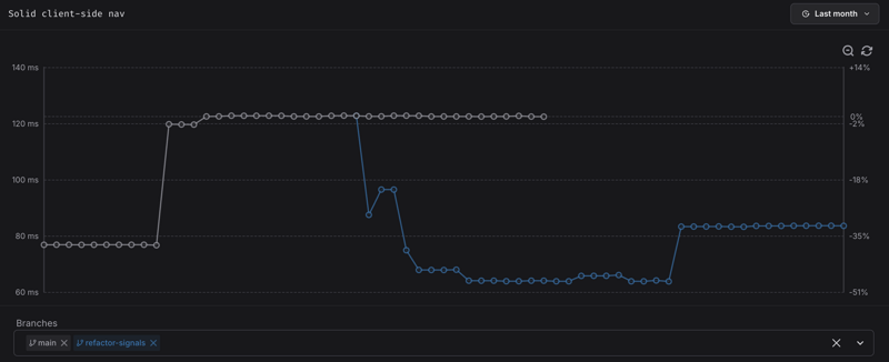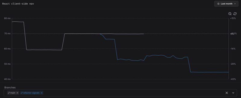 Our benchmarks isolate client-side navigation cost on a synthetic rerender-heavy page.6